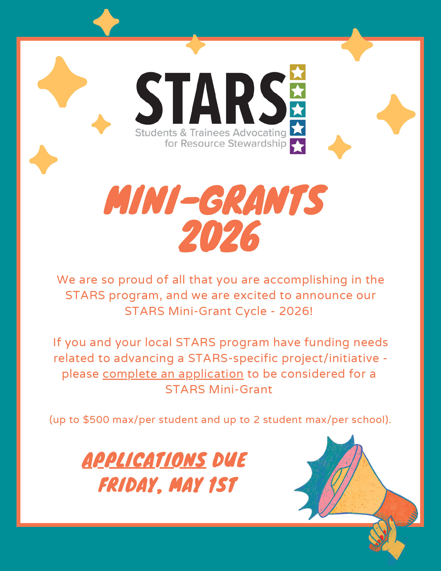We are so proud of all that you are accomplishing in the STARS program, and we are excited to announce our STARS Mini-Grant Cycle – 2026! If you and your local STARS program have funding needs related to advancing a STARS-specific project/initiative – please complete an application to be considered for a STARS Mini-Grant (up to $500 max/per student and up to 2 student max/per school).