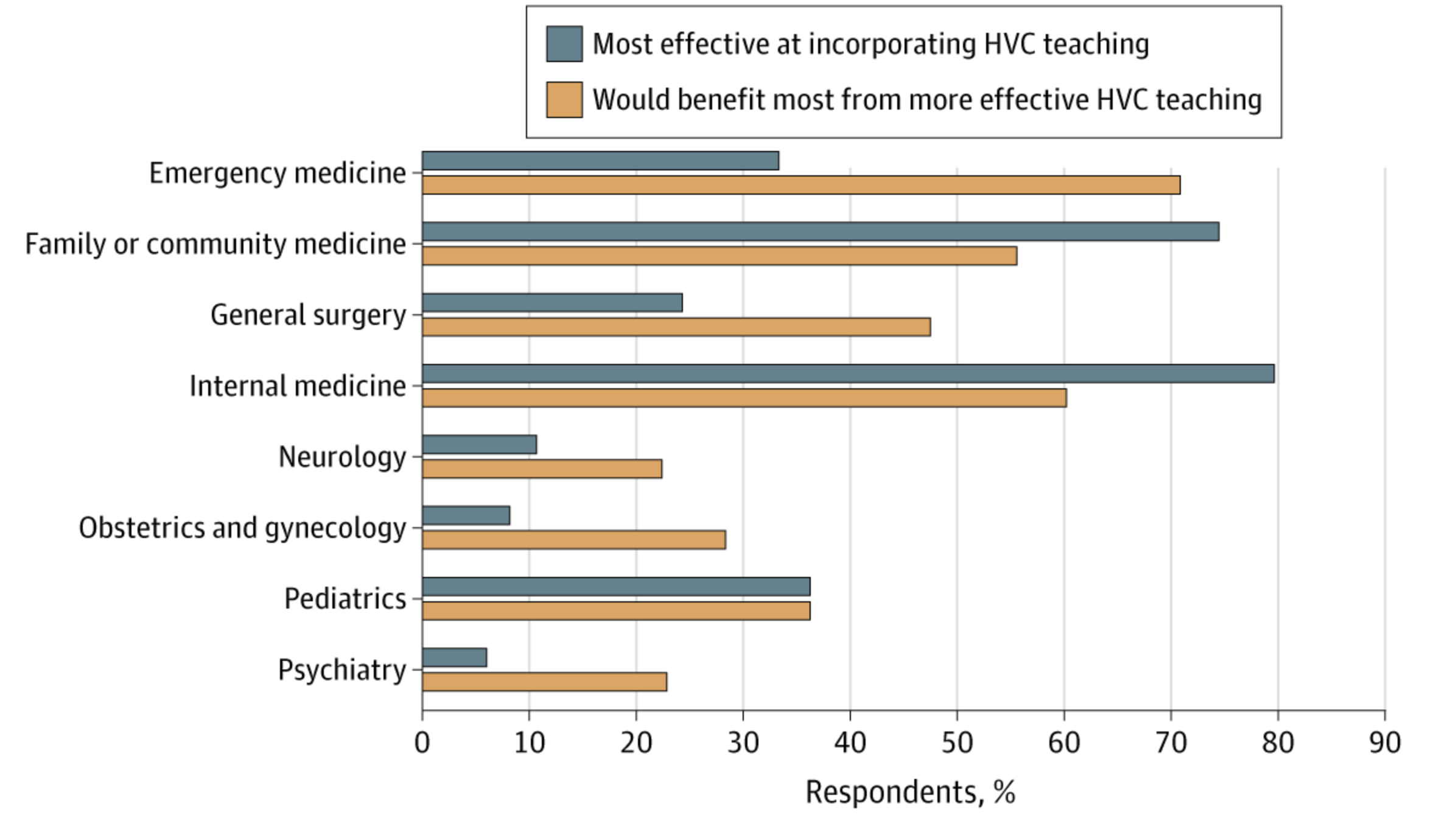 • Internal medicine and family or community medicine clerkships were perceived as most effectively incorporating HVC teaching, whereas emergency medicine and general surgery clerkships had the greatest discrepancy between the perceived need for effective HVC education and its current implementation…