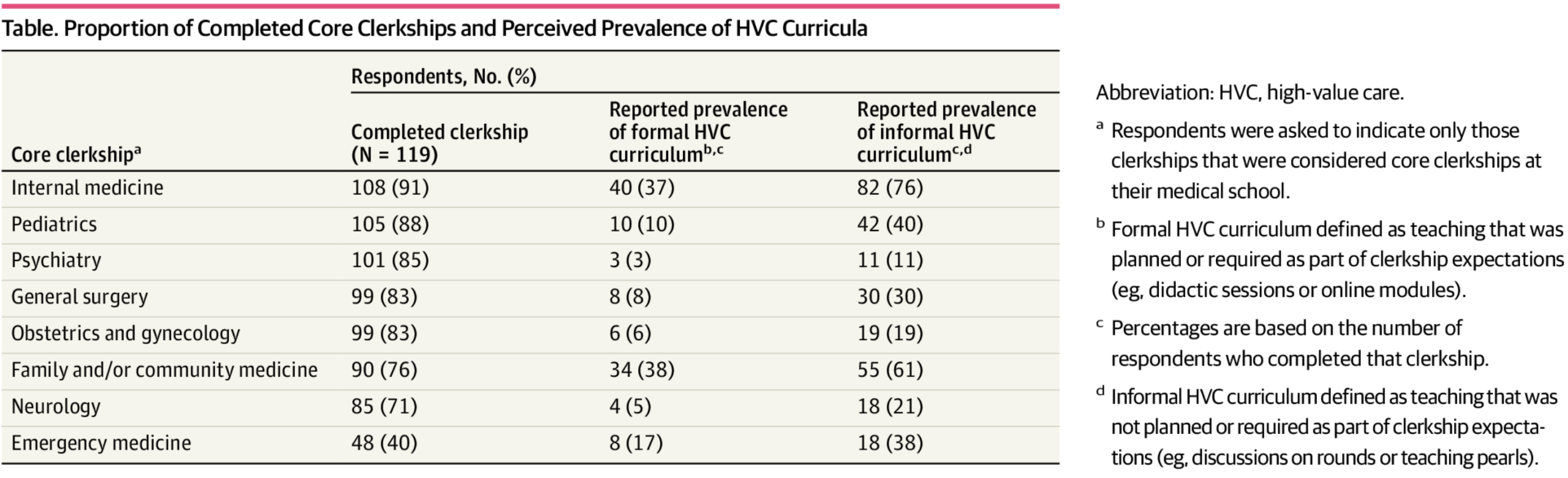 • The cross-sectional survey assessed the perceived prevalence and effectiveness of formal and informal HVC curricula in core clerkships across US medical schools;